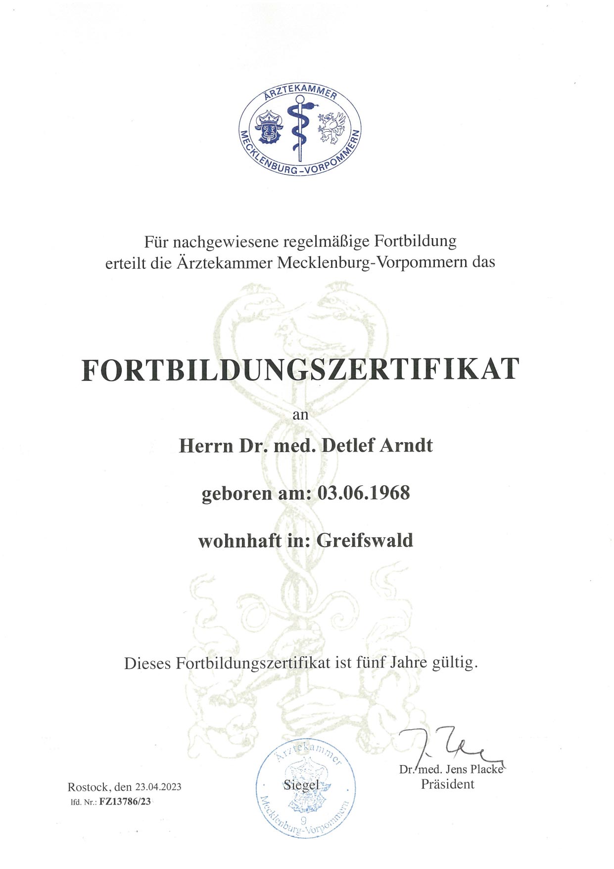 April 2023 – Fortbildungszertifikat der Ärztekammer Mecklenburg-Vorpommern für nachgewiesene regelmäßige medizinische Fortbildung