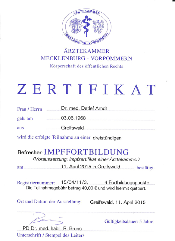 April 2015 – Impfzertifikat der Ärztekammer Mecklenburg-Vorpommern