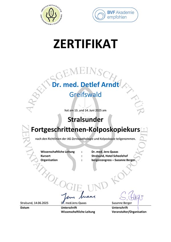 Juni 2025 – Zertifikat zum Stralsunder Fortgeschrittenen-Kolposkopiekurs nach Richtlinien der Arbeitsgemeinschaft für Zervixpathologie und Kolposkopie (AG CPD)