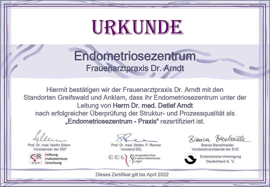 April 2022 – Re-Zertifizierung der Endometriosepraxis nach Kriterien der Stiftung Endometrioseforschnung (SEF), der Europäischen Endometrioseliga (EEL) und der Endometriose-Vereinigung Deutschland e.V.