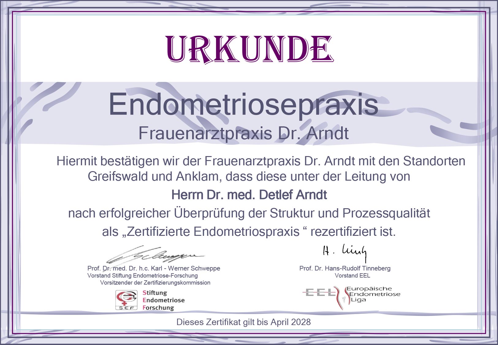 Mai 2025 – Re-Zertifizierung der Endometriosepraxis nach Kriterien der Stiftung Endometrioseforschnung (SEF), der Europäischen Endometrioseliga (EEL) und der Endometriose-Vereinigung Deutschland e.V.