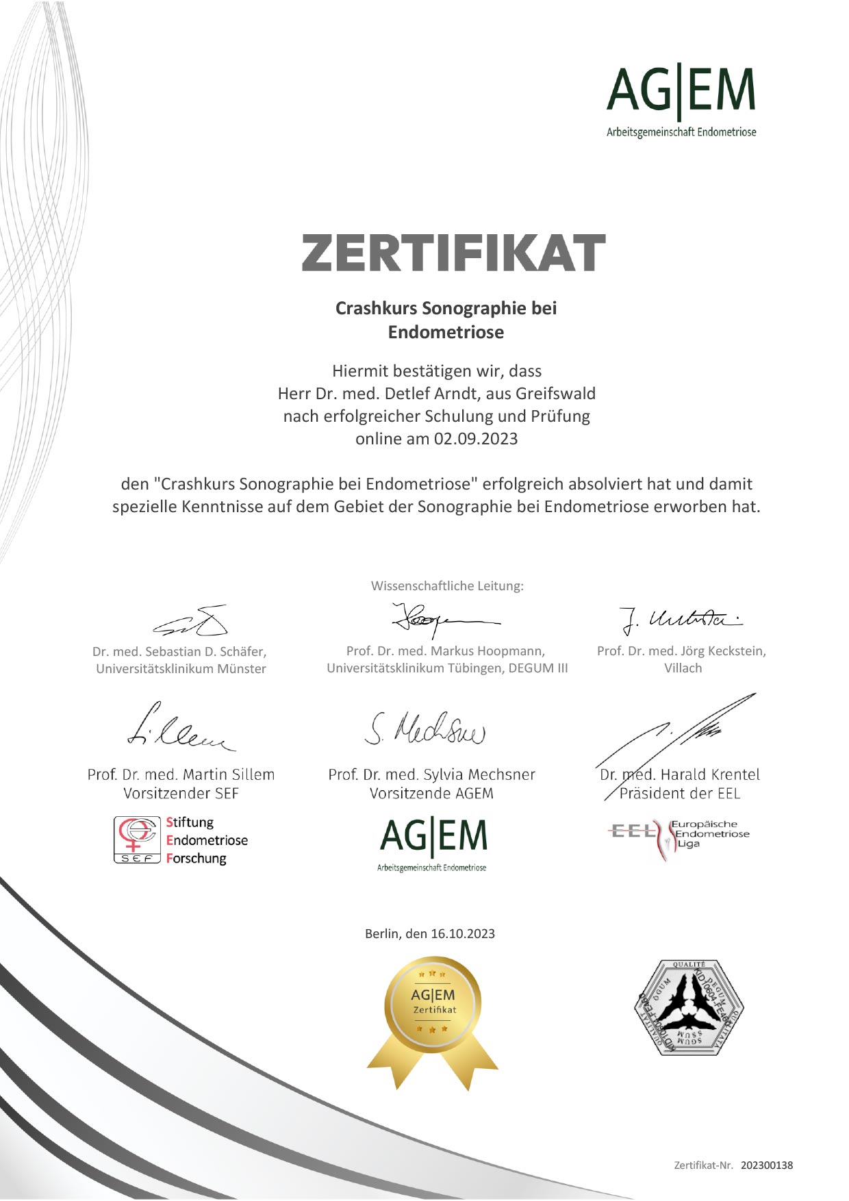 September 2023 – Zertifikat Sonographie bei Endometriose nach Richtlinien der Arbeitsgemeinschaft Endometriose (AGEM)